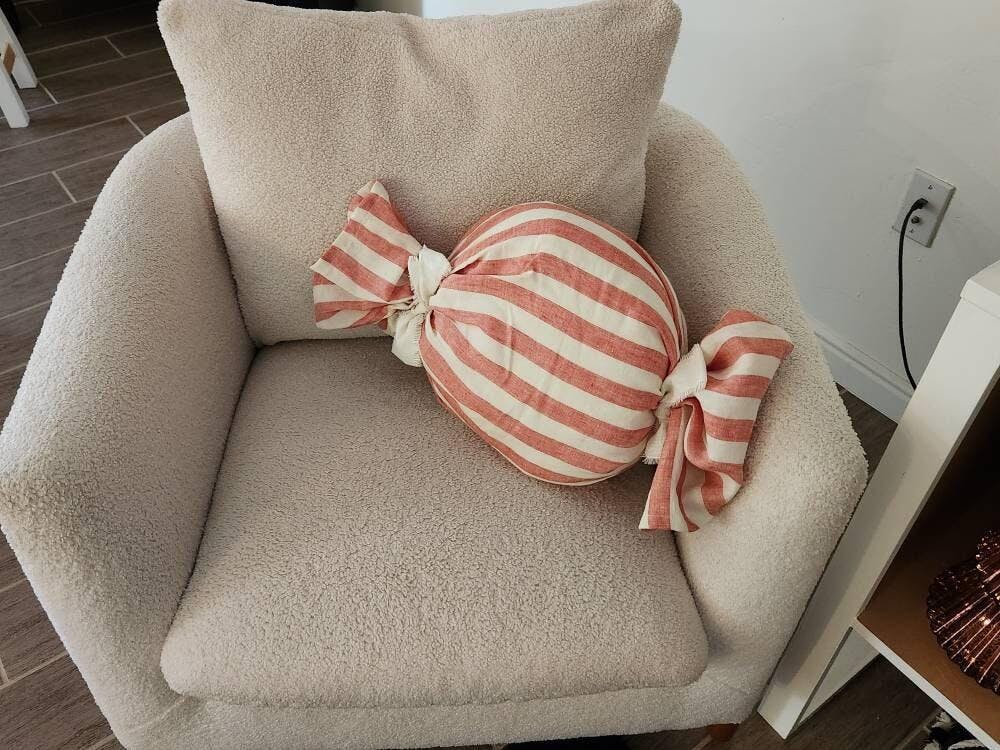 Our wrapped candy throw pillow is made of your favorite linen and adds a whimsical touch to your holiday decor, whether in the living room, your child's room or playroom. You may also enjoy our oversized candy cane pillow!